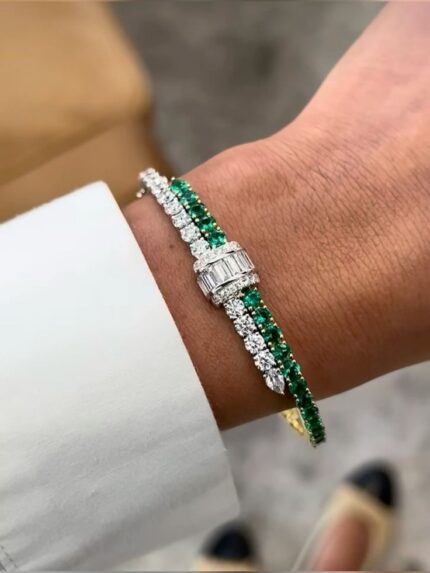 D&J Diamonds & Jewels Emerald & Diamond Baguette Clasp Tennis Bracelet in White Gold