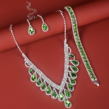 D&J Emerald Teardrop Crystal Bridal Necklace Set with Matching Earrings & Bracelet