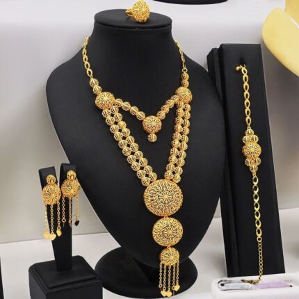 D&J Diamonds & Jewels 24K Gold Color Four-Piece Jewelry Set – Dubai Style Necklace, Bracelet, Earrings & Ring for Women