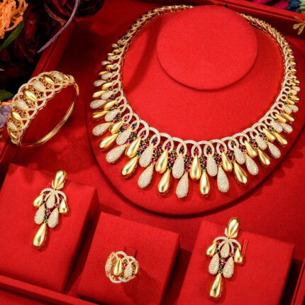 D&J Luxury Gold Teardrop Bridal Jewelry Set – Statement Necklace, Earrings, Ring & Bangle Set for Women