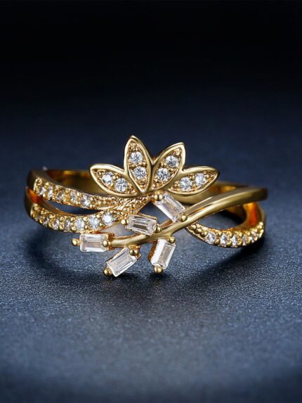 D&J Diamonds & Jewels Gold Tone Floral Crystal Statement Ring – Elegant Leaf Design Luxury Band for Women