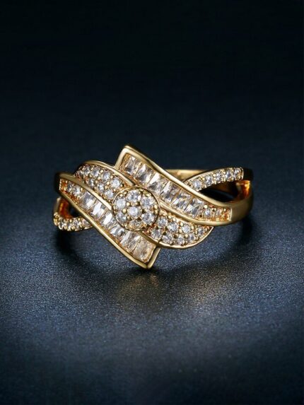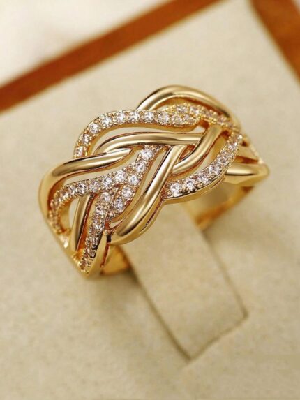 D&J Diamonds & Jewels Gold Tone Intertwined Crystal Statement Ring – Elegant Twist Design Luxury Band for Women
