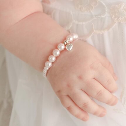 D&J Diamonds & Jewels Baby Pearl Bracelet with Heart Charm – Elegant Silver-Tone Kids Jewelry