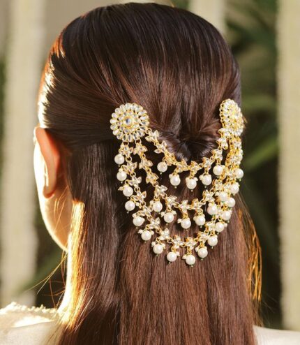 D&J Royal Kundan Circle Bridal Hair Brooch | Antique Gold Chain Hair Accessory