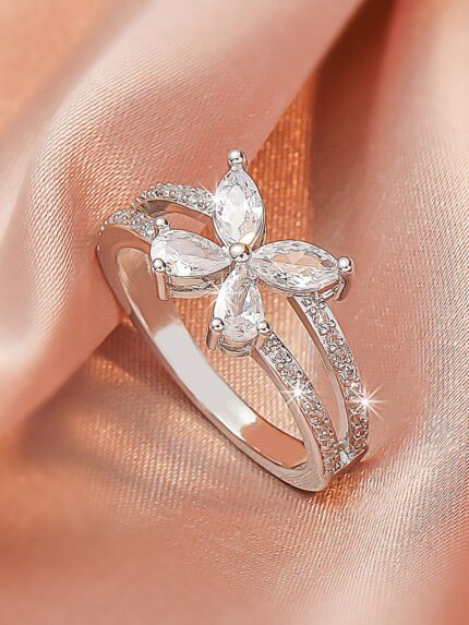 D&J Diamonds & Jewels Silver Tone Marquise Crystal Floral Ring – Elegant Double Band Designer Ring for Women