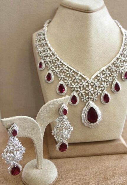 D&J Regal Ruby Teardrop Floral Bridal Necklace Set with Statement Earrings