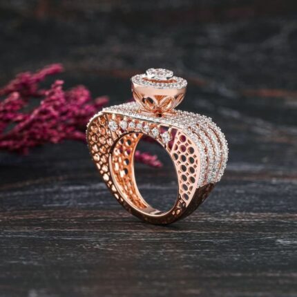 D&J Rose Gold Royal Halo Statement Ring – Luxury Pave Crystal Wide Band for Women