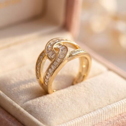 D&J Diamonds & Jewels Gold Tone Infinity Baguette Crystal Ring – Elegant Luxury Statement Band for Women