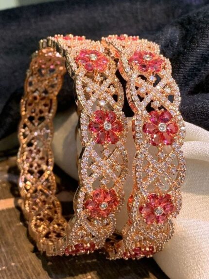 D&J Rose Gold Floral Ruby Zircon Bangles – Luxury Bridal Statement Kada Set for Women