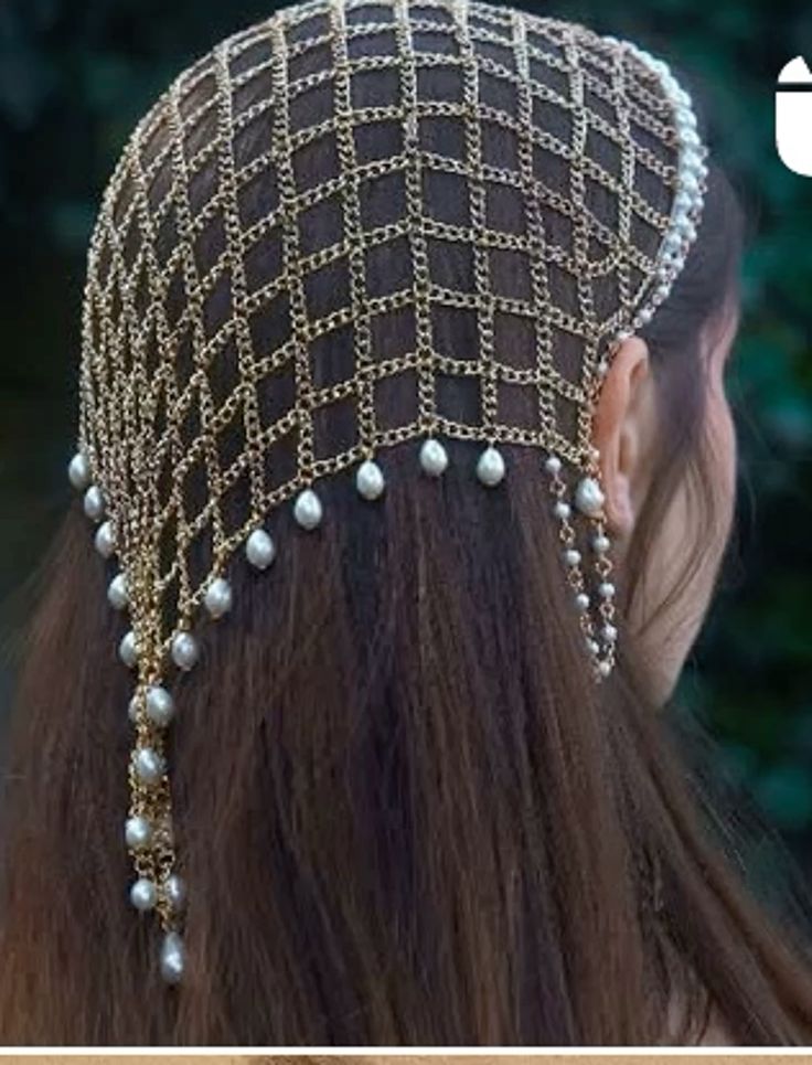 Delicately placed pearl drops adorn the edges and cascade softly along the sides, adding movement, femininity, and a luminous contrast to the geometric chain design. The netted construction hugs the head comfortably, making it both visually striking and wearable for long ceremonial events.