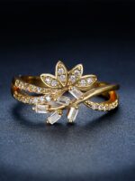 Inspired by nature, this elegant ring features a graceful floral and leaf motif adorned with sparkling round and baguette-cut crystals. The flowing crossover band design is enhanced with pavé-set stones, creating a radiant shimmer from every angle.