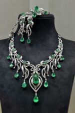 The matching statement earrings mirror the necklace’s elegant curves and are finished with emerald teardrop accents, completing this breathtaking ensemble.