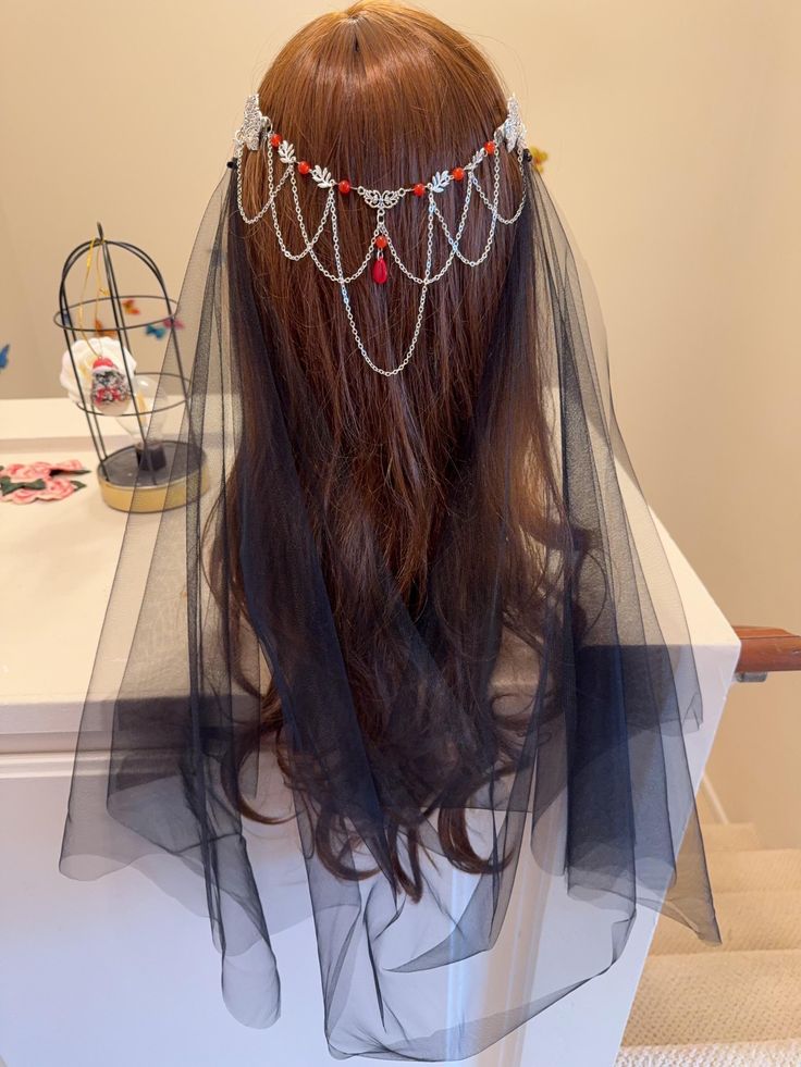 Paired with a flowing black tulle veil, the layered chain drape falls beautifully across the back of the hair, adding depth, movement, and a couture finish. Perfect for modern brides, gothic weddings, evening ceremonies, themed events, photoshoots, and high-fashion styling, this piece makes a bold statement while remaining refined.