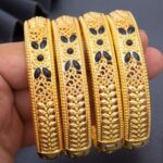 Each bangle showcases ornate filigree patterns, textured borders, and carefully placed black stone motifs that add depth and character to the design. The layered detailing and sculpted elements reflect classic heritage artistry while maintaining a bold, contemporary presence on the wrist.