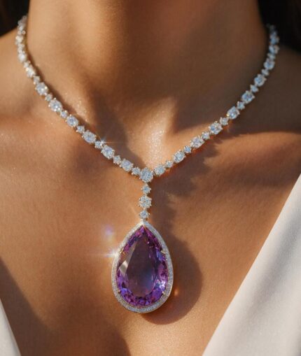 D&J Luxury Purple Teardrop Pendant Necklace – Silver Crystal Statement Jewelry for Women