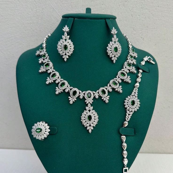 The necklace showcases beautifully linked oval emerald centers framed with shimmering stones, leading to a statement pendant that adds graceful movement and sparkle. The matching drop earrings mirror the intricate halo pattern for a perfectly balanced look. Completing the set are a coordinating statement ring and an elegant bracelet, crafted to enhance the overall brilliance of this regal collection.