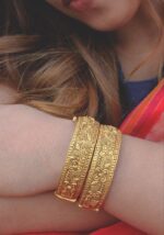 The wide bangle silhouette is framed with finely detailed borders, enhancing the richness of the handcrafted carvings. Designed to sit gracefully on the wrist, these bangles offer a luxurious presence while remaining comfortable for extended wear. Their warm gold tone radiates sophistication, making them a perfect statement for traditional and ceremonial occasions.