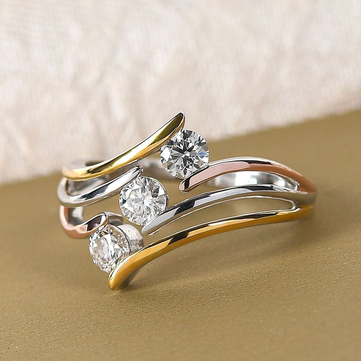 D&J Tri-Tone Wave Diamond Look Ring – Multi-Band Open Statement Ring for Women