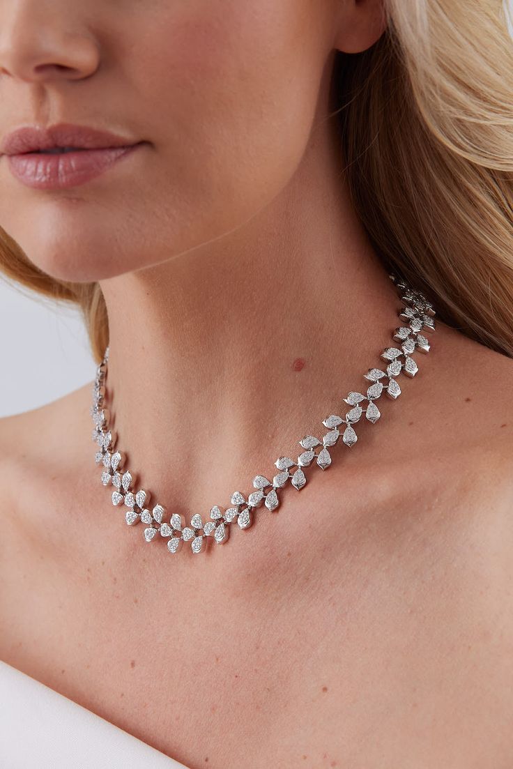 Experience instant glamour with the D&J Lierre Gold & Diamond Necklace, a stunning statement piece crafted in 18K white gold. Featuring interconnected diamond clusters arranged in an elegant pear-shaped design, this necklace radiates brilliance and symmetry from every angle.