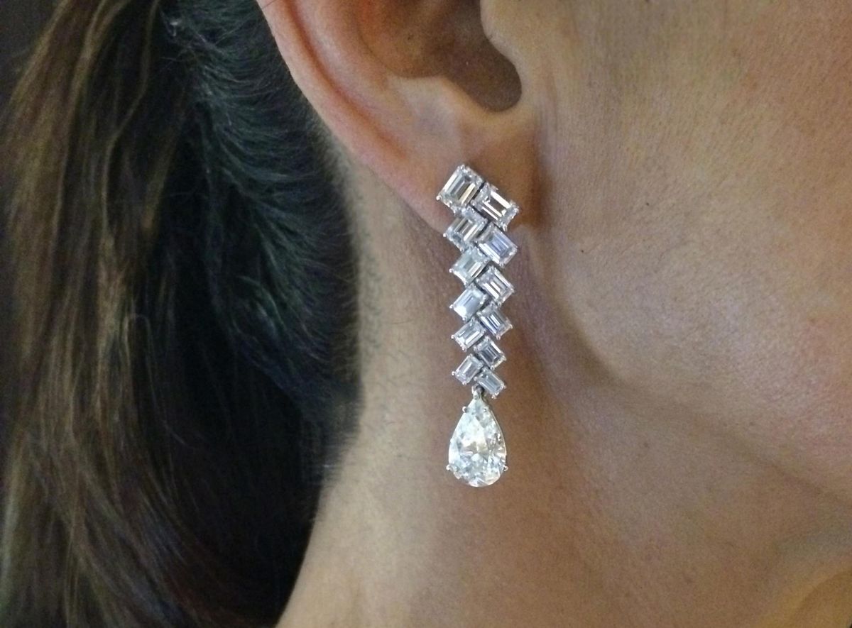 Diamonds, diamonds, and more diamonds! Experience the breathtaking elegance of D&J Norman Silverman-inspired platinum earrings, featuring pear-shaped and emerald-cut diamonds for maximum sparkle and sophistication. Perfect for bridal glamour, red-carpet moments, or luxury events where every detail counts.