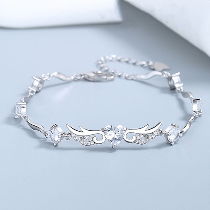 At the center of this stunning design sits a brilliant heart-shaped crystal, sparkling beautifully with every movement. Delicately extending from each side are finely crafted angel wings, adorned with shimmering crystal accents that enhance the bracelet’s luminous appeal. The wings gently curve toward the heart, creating a romantic and protective embrace.